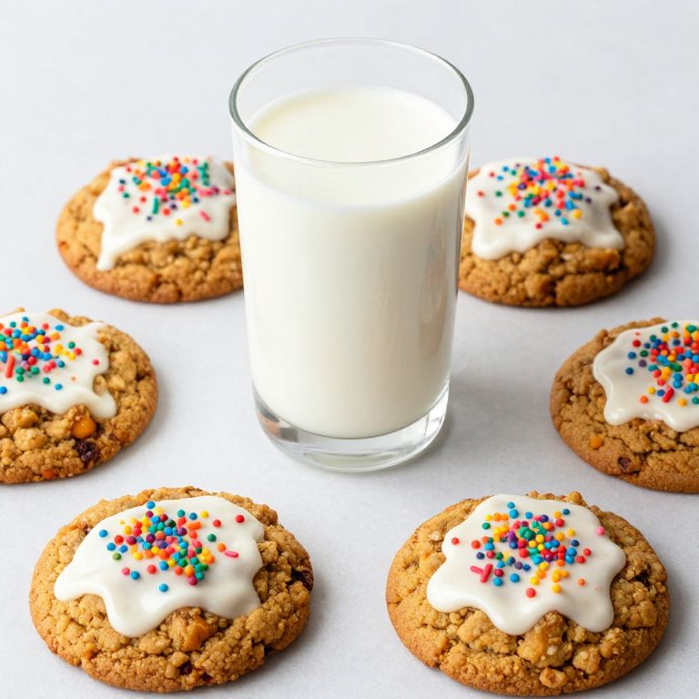 Six soft and chewy gluten-free and vegan pumpkin oatmeal cookies, each topped with a glossy white chocolate glaze and colorful sprinkles, are artfully arranged around a glass of milk on a light surface, creating a festive and inviting dessert display. #ad