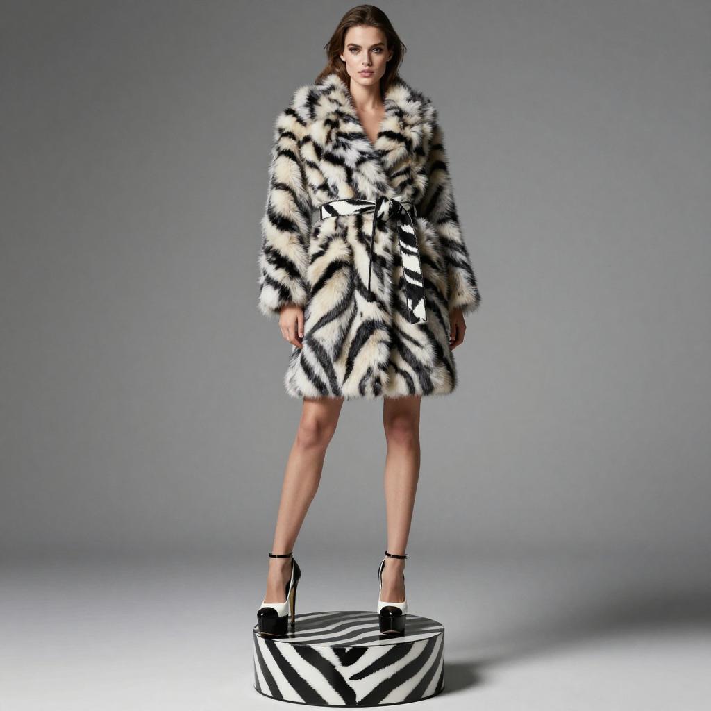 Glossy fashion magazine cover featuring a tall female model wearing a zebra-patterned fur coat belted at the waist. The model stands confidently on a matching zebra-striped platform wearing black and white high-heeled platform shoes. The background is a simple, gradient gray, highlighting the striking monochrome outfit and elongated legs of the model.