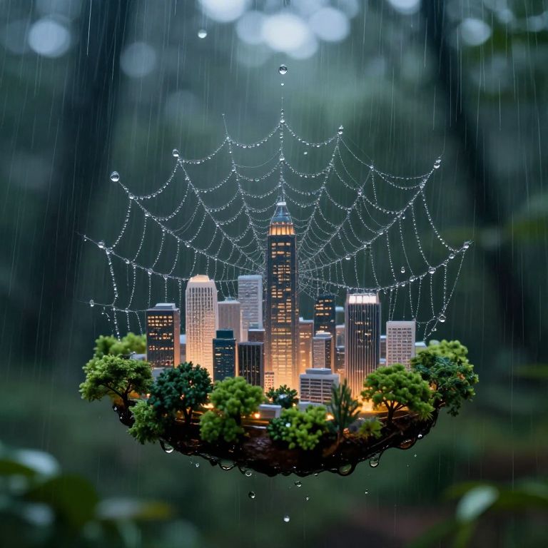 Photograph of a miniature cityscape suspended in mid-air, encircled by lush green trees. The city features illuminated skyscrapers with warm yellow and orange lights against a dark, rain-soaked background. A delicate spiderweb, adorned with sparkling dewdrops, arches over the city, creating a magical effect. Raindrops are visible, adding to the atmosphere. The blurred, dark green forest serves as the backdrop, enhancing the city's glow and the intricate web's details. The overall scene combines elements of nature and urban life, evoking a sense of enchantment and serenity.