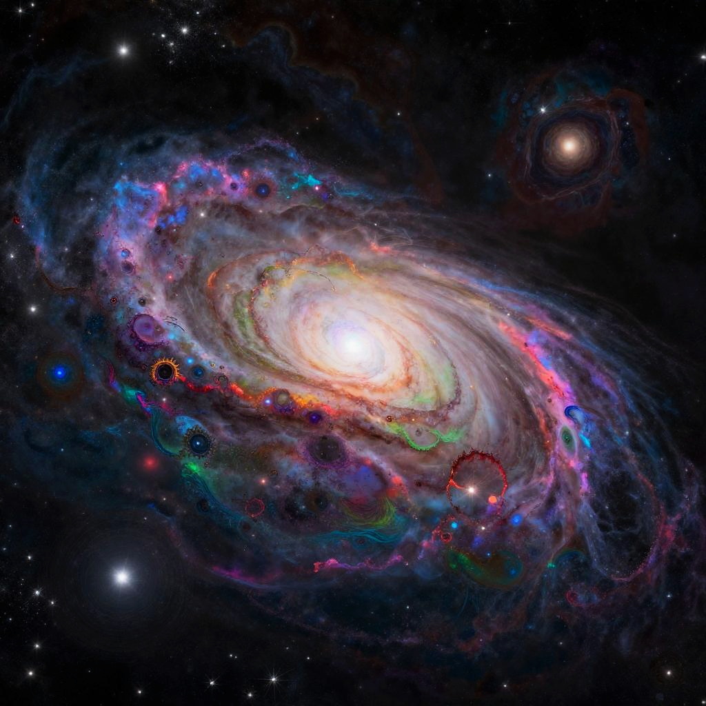 Photograph of a vibrant spiral galaxy in space, captured in high detail. The galaxy's bright, glowing core is surrounded by swirling clouds of blue, purple, and pink gas and dust. Multiple layers of colorful, translucent rings spiral outward, creating a dynamic, textured appearance. The background is a deep, star-speckled black, with several smaller, distant galaxies visible. Bright stars of varying sizes and intensities are scattered throughout, adding depth to the cosmic scene. The image showcases the galaxy's intricate structure and the beauty of the universe.