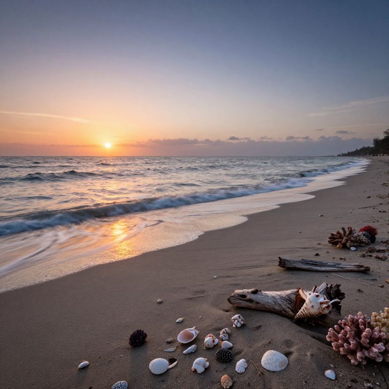 Photograph of a serene beach at sunset, featuring gentle waves, smooth sand, scattered seashells, driftwood, and colorful coral in the foreground