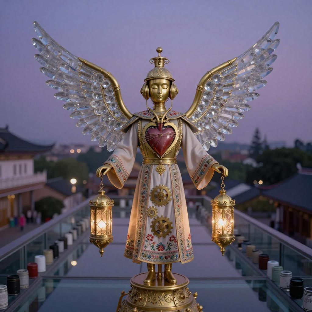 Clockwork nightingale diplomat — lacquered brass body, crystalline wings, filament-core heart and embroidered gear-robe perched in temple spire of hanging lanterns suspended over a glass-canyon of reflected prayers beneath a violet dusk sky. Shot on Hasselblad X2D 100MP with 120mm XCD lens, hyperdetailed, 8K HDR, soft lighting, cinematic atmosphere.