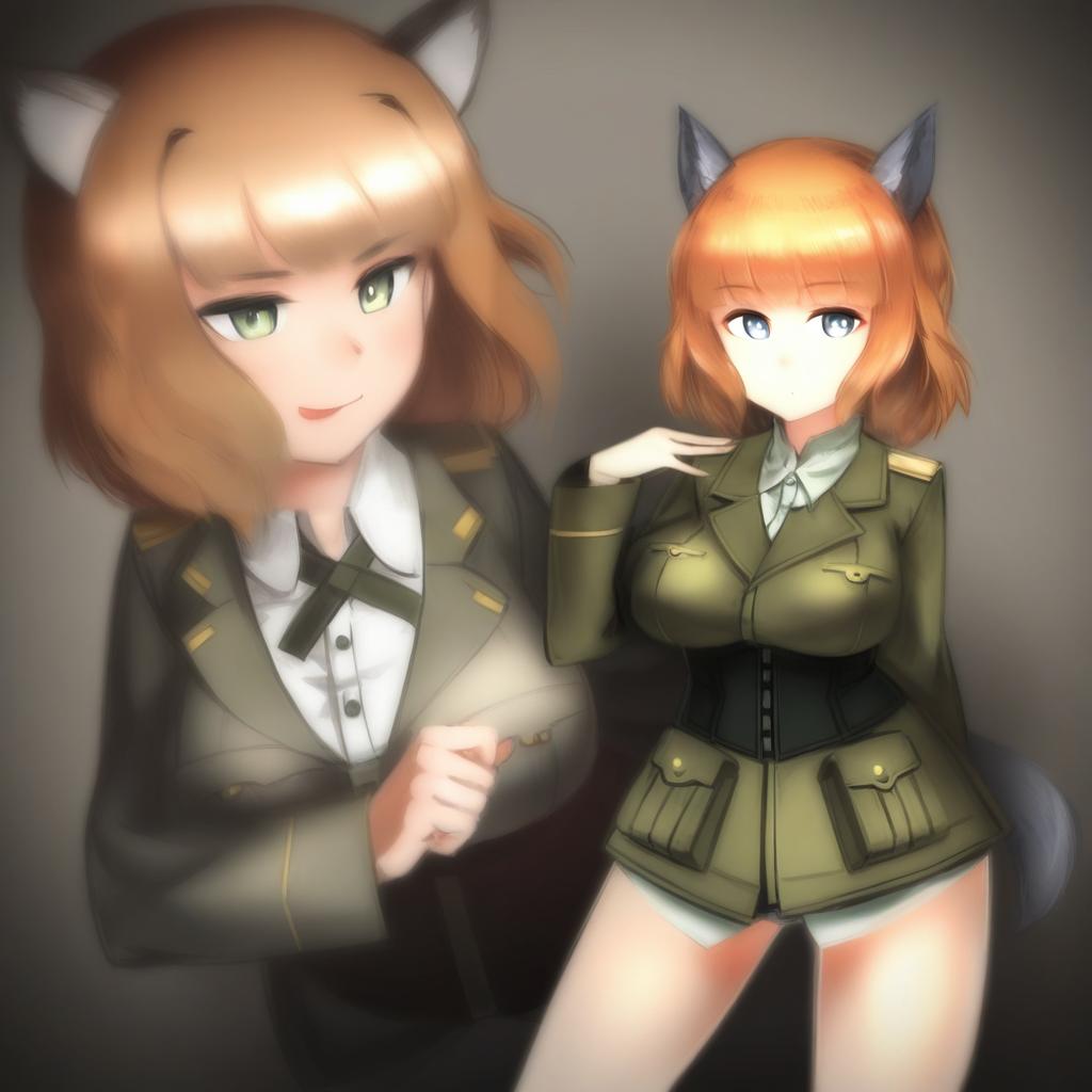 Gundula rall, world witches series, 1girl, wolf girl, wolf ears, wolf tail, blue eyes, green eyes, short hair, brown hair, orange hair, large breasts, military uniform, by artist ribiadan, leet