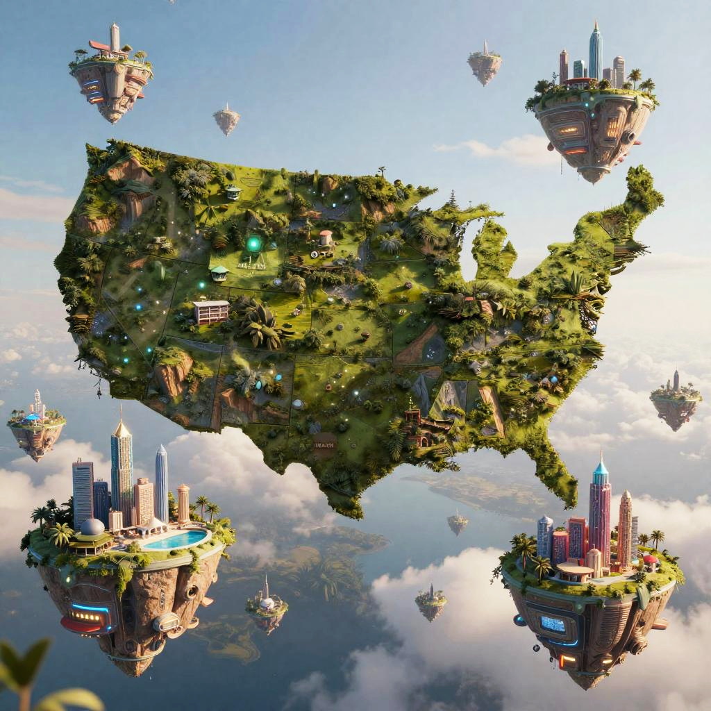 Alternate US map with states redesigned as futuristic floating islands, each island showing unique landscapes and vibrant cityscapes, in a surreal sci-fi style, soft glowing lights, high detail, digital art.