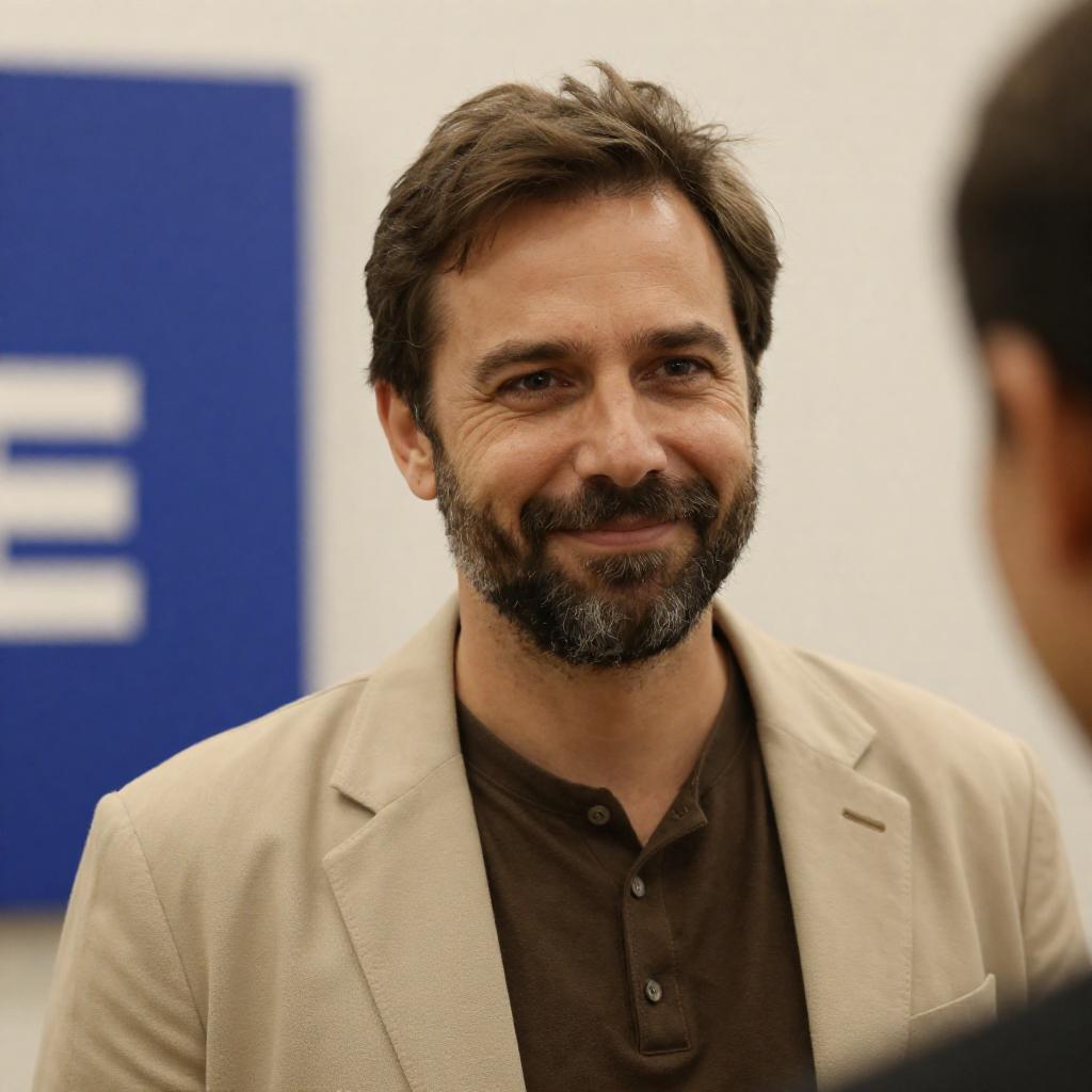Photograph of a middle-aged man with short brown hair, light stubble, and a slight smile, holding a wooden pole with both hands. He wears a beige jacket over a light blue shirt. Background is blurry with bokeh lights. One blurred head in foreground. Man's expression is playful and slightly mischievous.