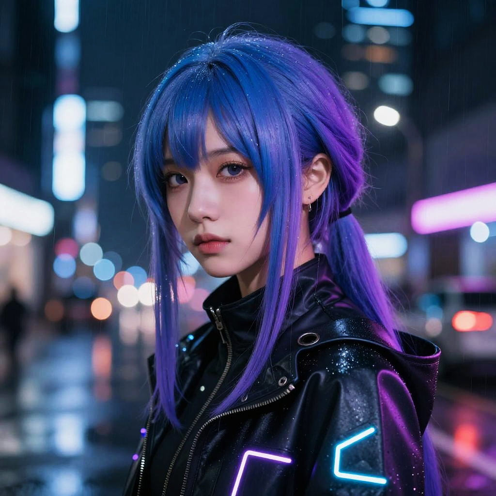 Blueish purple hair styled in futuristic cyberpunk fashion, glowing neon accents, sleek and sharp, urban night cityscape background with rain reflections
