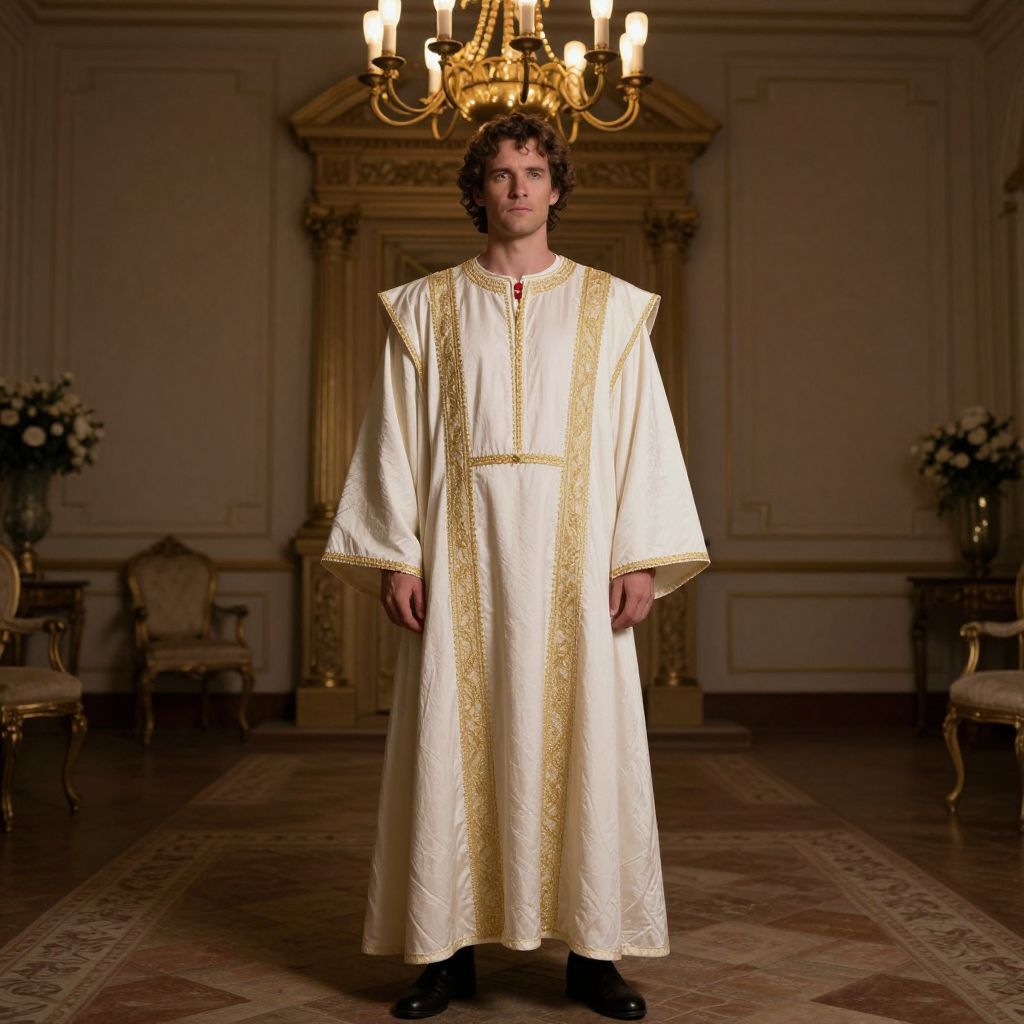 Tunic Costume, man in a robe standing in a room with a chandelier