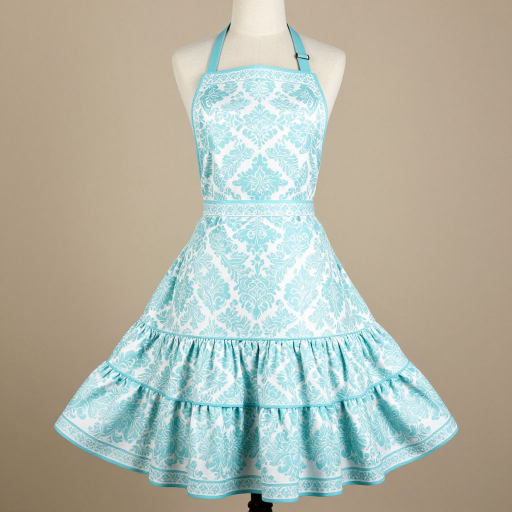 Damask Print Accented with Aqua Womans Retro Apron With Tiered Skirt And Bib