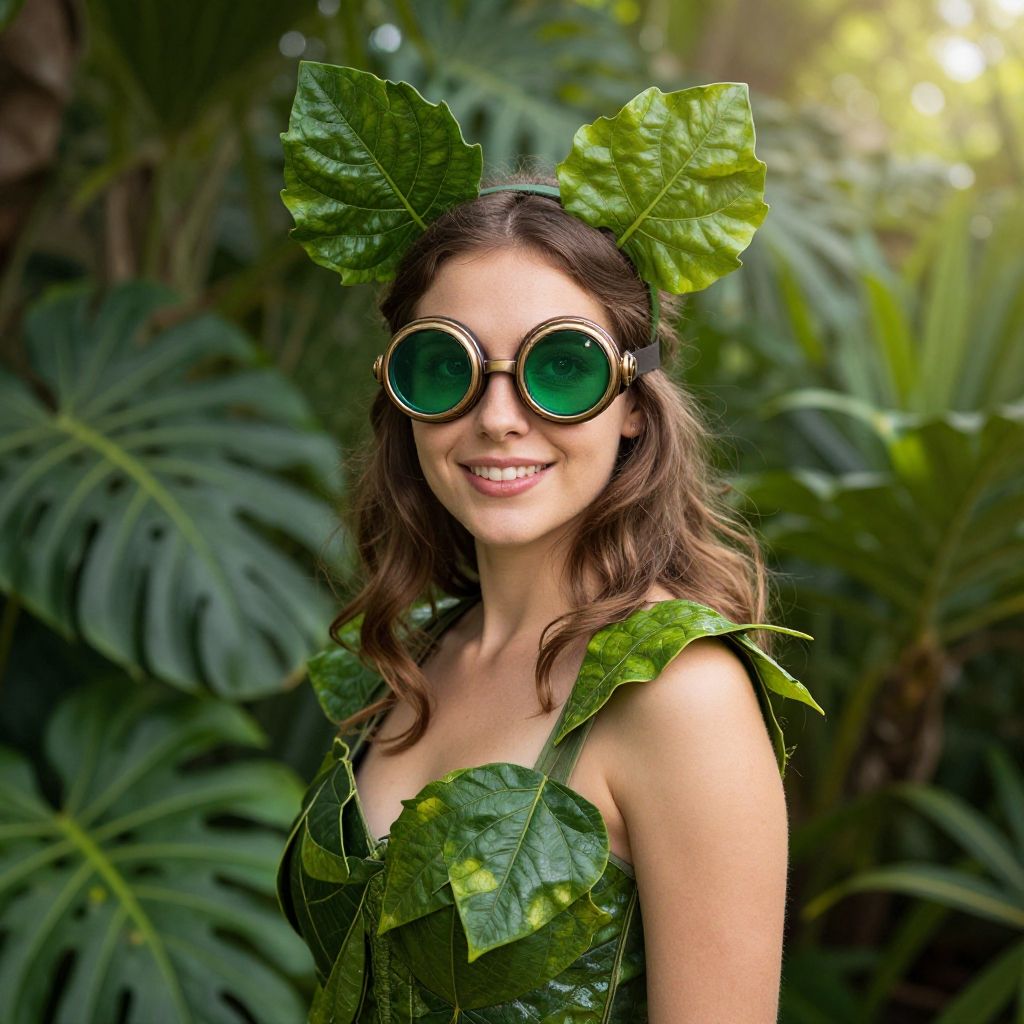 Portrait of a young woman wearing a leafy green outfit and steampunk-style round goggles with green lenses. She is surrounded by lush tropical leaves, highlighted by soft sunlight from the upper right corner, creating a vibrant and natural atmosphere. Her attire includes a headpiece adorned with large green leaves, matching the foliage background.