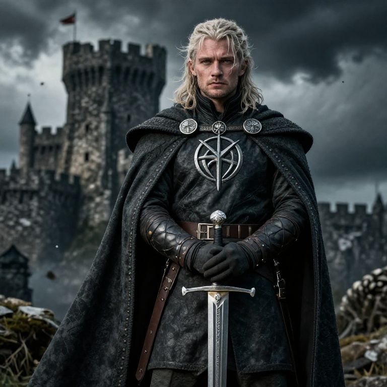 Game of Thrones OC maker, a high-resolution portrait of an original Westeros hero wearing a custom sigil cape, rugged medieval attire, holding a sword, with a stormy castle background, dynamic shadows, photorealistic fantasy style