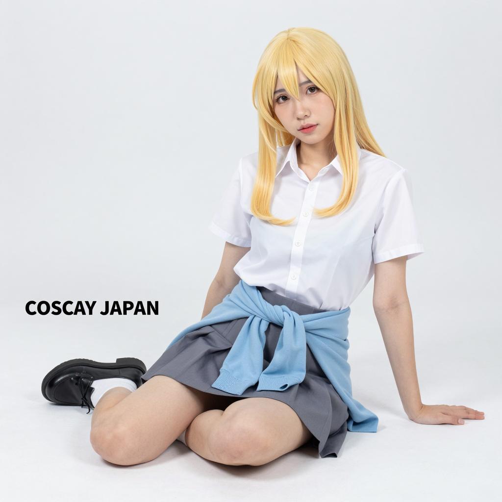 Realistic photo of four women in cosplay against a blue gradient background. They wear dark blue denim jackets and skirts paired with black boots and leg warmers. From left to right, two women have pink wigs and ties, one has a blonde wig with a black tie, and one has a blue wig with a low-cut top. The text 'CKS * JAPAN' appears above them.