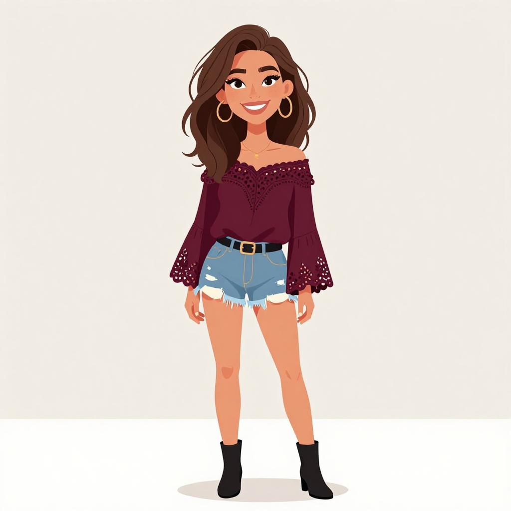 Woman with pretty face and pretty hair. smiling Woman, bohemian, white off-the-shoulder dress with spaghetti straps, mid-thigh length, bell sleeves with lace detailing, scalloped lace hem, minimal jewelry, plain background. --sref 1467