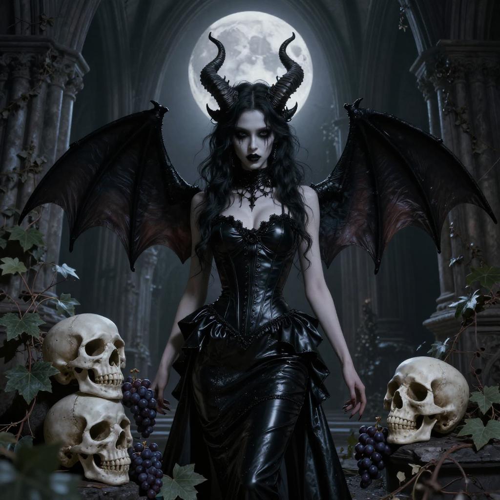 Gothic, digital art, bat-winged woman, black latex dress, full moon, skull, grapes, ivy, dark cathedral, horns, pale face, eerie, fantasy, dark fantasy, gothic fashion, sinister, mysterious, detailed, high contrast, night scene