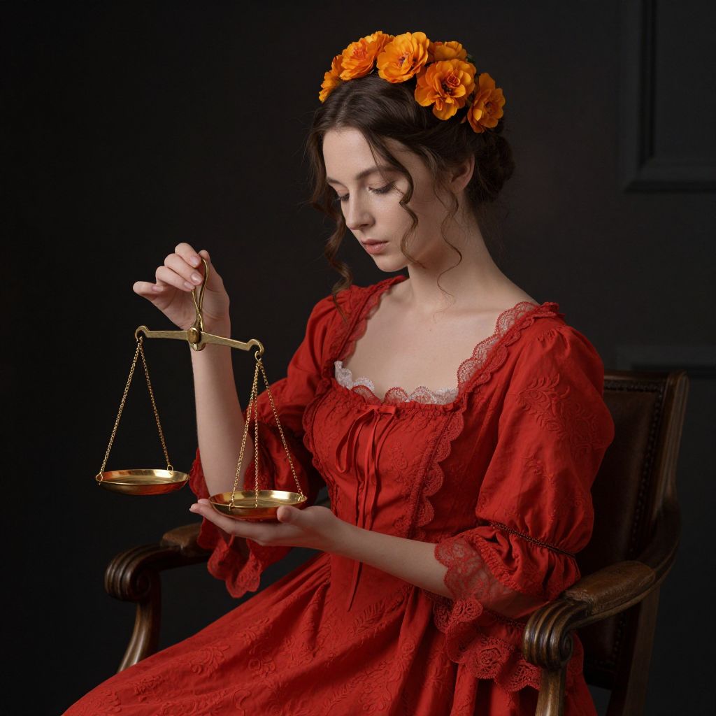 Elegant portrait of a woman seated in a dark room, wearing a richly detailed red dress with lace trim, her hair adorned with vibrant orange flowers, holding a small golden scale in her hands, exuding a sense of classical sophistication and introspection.