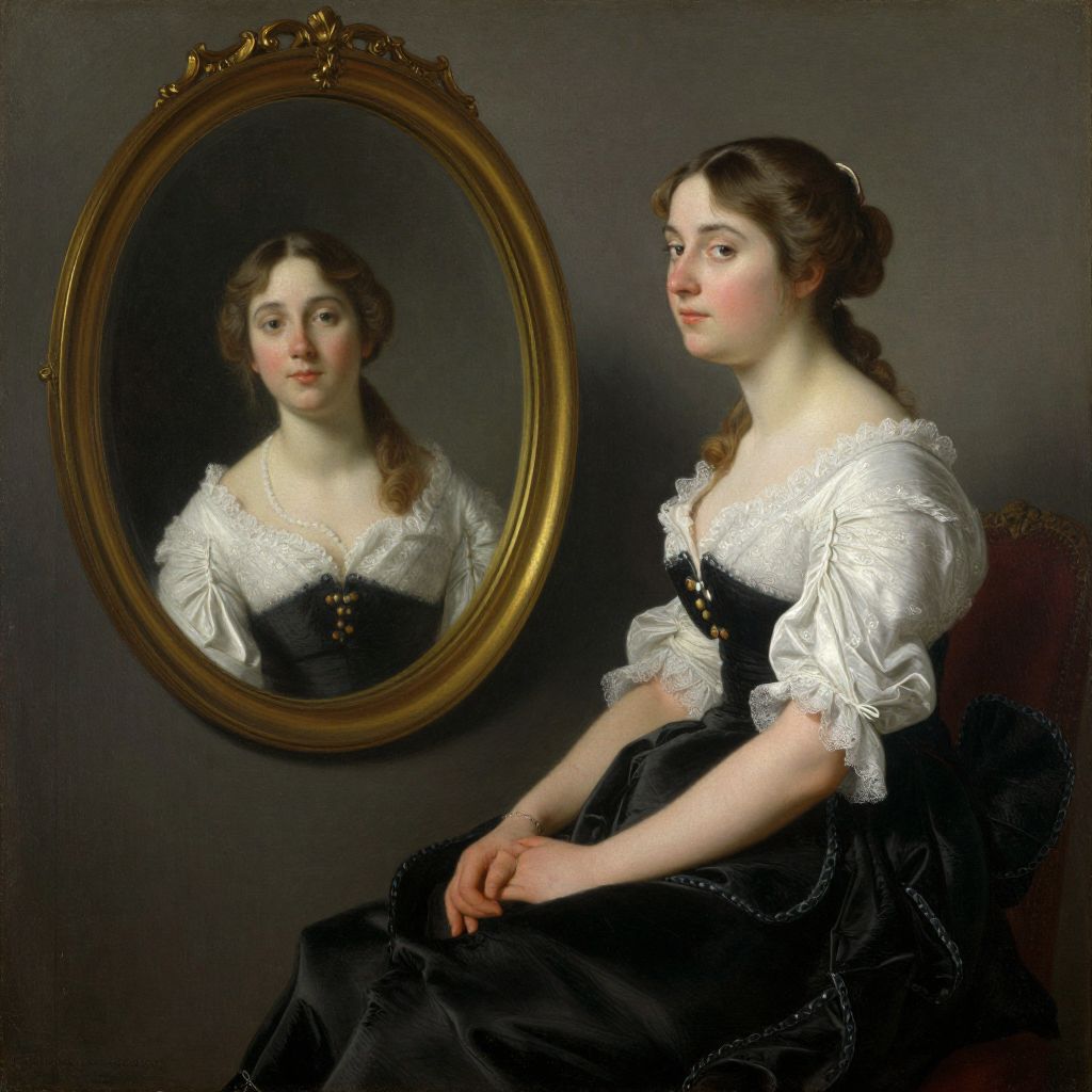 Classical portrait painting of a pale-skinned, brown-haired woman in an off-shoulder white dress, seated before an ornate mirror.