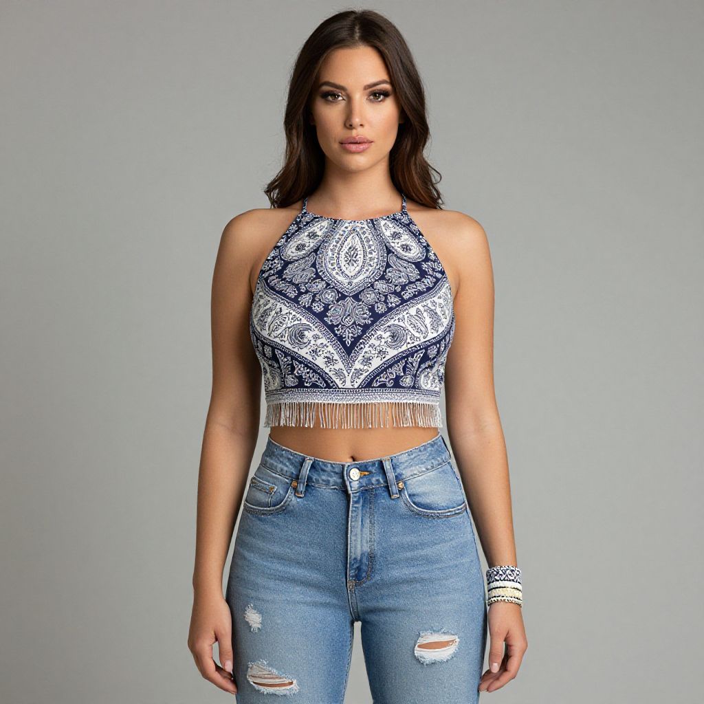 "Woman, bohemian, sleeveless halter neck crop top with white and navy paisley print, fringe detailing at hem, light wash distressed skinny jeans, high waist with button closure, prominent front pockets, cuff bracelet on one wrist.. Sexy. Pretty face and beаutiful eyes. Big breasts."