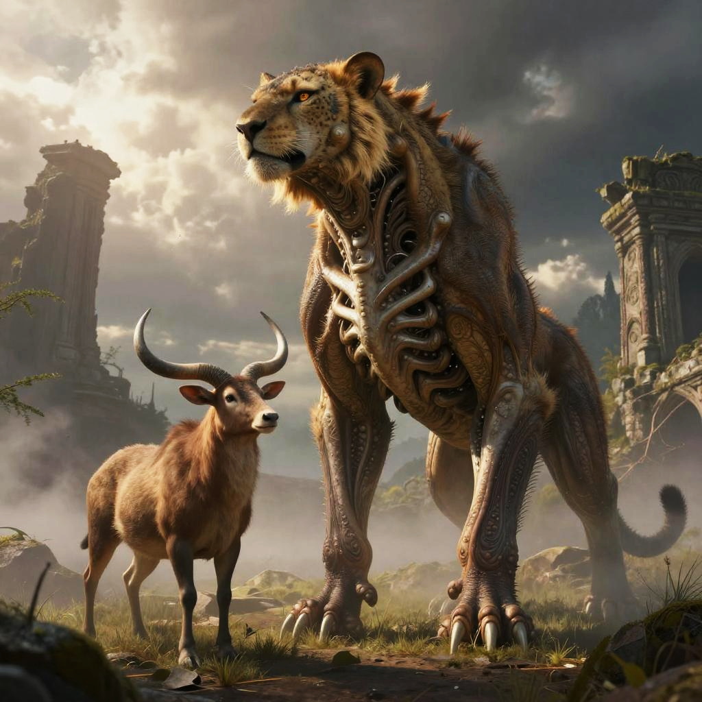 Animal hybrids generator creating fantastical creatures combining features of predators and herbivores, portrayed in a mystical landscape with fog, ancient ruins, and dramatic skies, emphasizing contrast and imaginative anatomy.