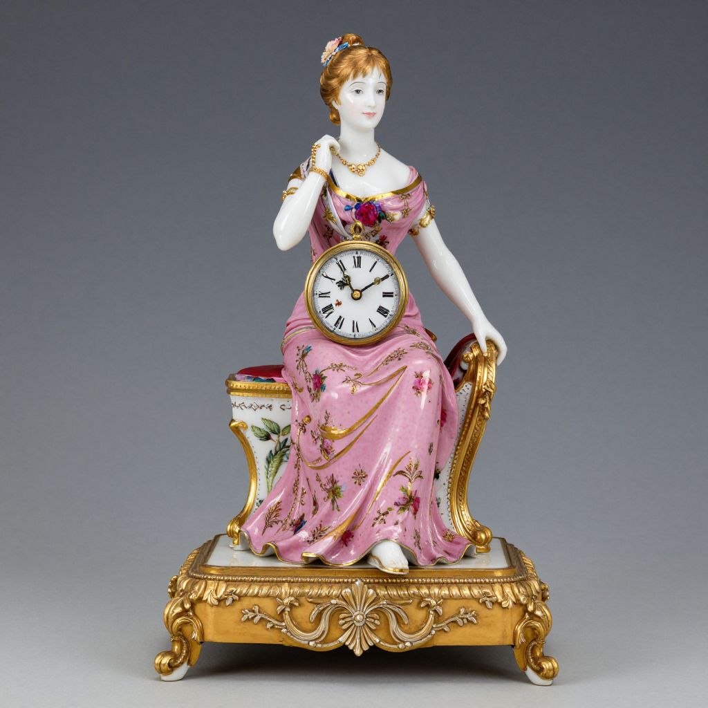 Elegant late 19th-century French porcelain clock featuring a seated woman in a pink dress, intricately detailed with gold accents, floral patterns, and a classic Roman numeral face, set atop an ornate golden base.