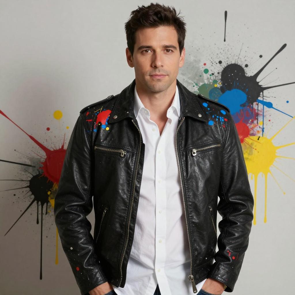 Portrait of a man wearing a black leather jacket and white shirt, standing against an abstract background with colorful paint splatters in red, blue, yellow, and black. The man has short dark hair and a neutral expression, with hands in pockets. The overall style combines realistic portraiture with Jackson Pollock-inspired drip painting effects on the jacket and backdrop.