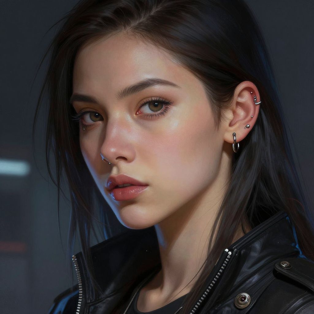 Photorealistic portrait of a young woman with fair skin, dark hair, piercing nose ring, hoop earrings, and black leather jacket, illuminated by soft