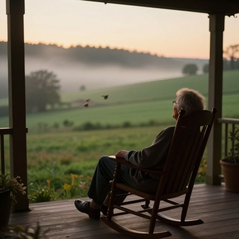 Abuelo sitting peacefully on a rustic wooden rocking chair on a sunny porch, surrounded by lush greenery and colorful flowers, wearing a warm knitted sweater and glasses, with a gentle smile reflecting wisdom and love, soft morning light, photorealistic style.