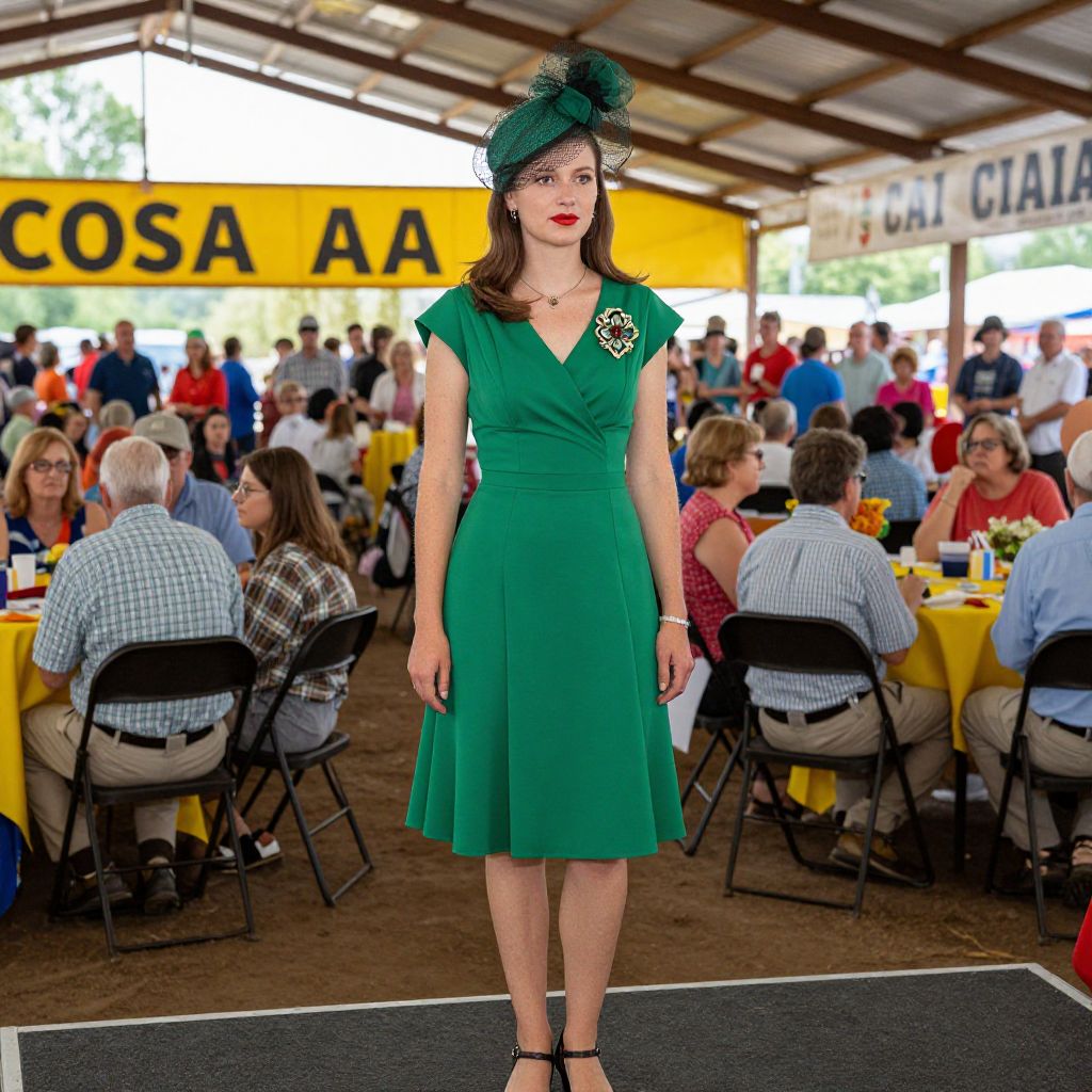 The image depicts a vibrant scene from the Miss Coal 1981 pageant at a county fair in West Virginia. A woman in a striking green dress with a floral brooch and a matching hat stands confidently in the foreground, her poised stance commanding attention. The background is bustling with a diverse crowd of people, some seated at tables draped in yellow tablecloths, while others stand, engaged in conversation or observing the event. The setting is an open-air pavilion with a yellow banner reading \"COSA AA\" and another banner in the background displaying \"CAI CIAIA.\" The overall composition is dynamic, with the woman in the green dress as the focal point, surrounded by the lively atmosphere of the fair. The colors are vivid, with the green dress and yellow banners creating a visually appealing contrast against the more muted tones of the crowd and the pavilion.