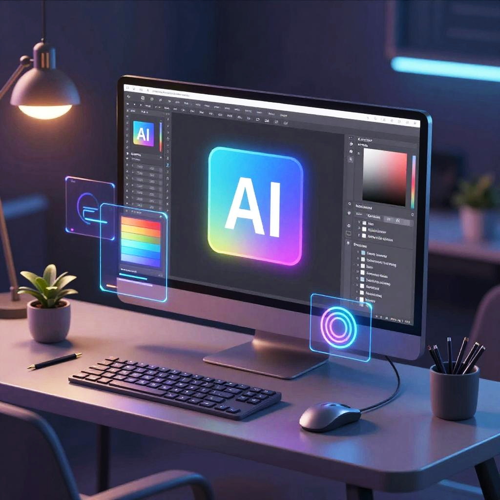 Illustrator AI tools depicted as a futuristic digital workspace, featuring sleek interfaces, glowing icons, and a holographic design palette floating above a high-tech desk, vibrant colors with a cyberpunk aesthetic, sharp details and dynamic lighting.