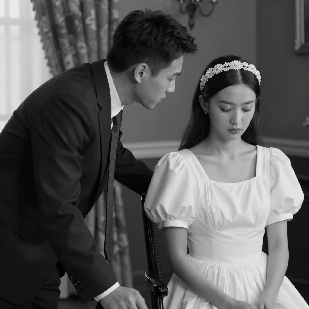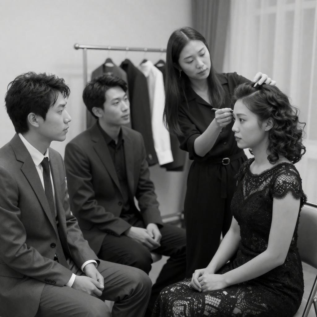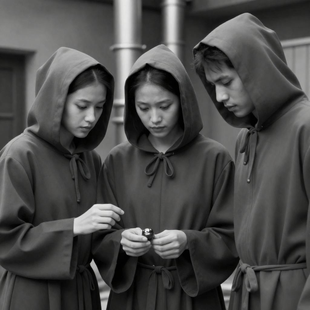 Black-and-white photograph of three people in hooded robes, leaning together indoors. Woman on left, woman in center, man on right. Hooded robes with tied neck cords. Woman in center holds a small object. Metal pipes in background. Intense expressions.