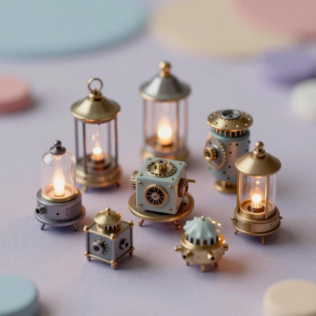 A micro fetish concept featuring tiny mechanical gadgets and delicate ornaments, detailed and realistic textures with soft glowing lights, set on an abstract colorful background, ultra high-resolution