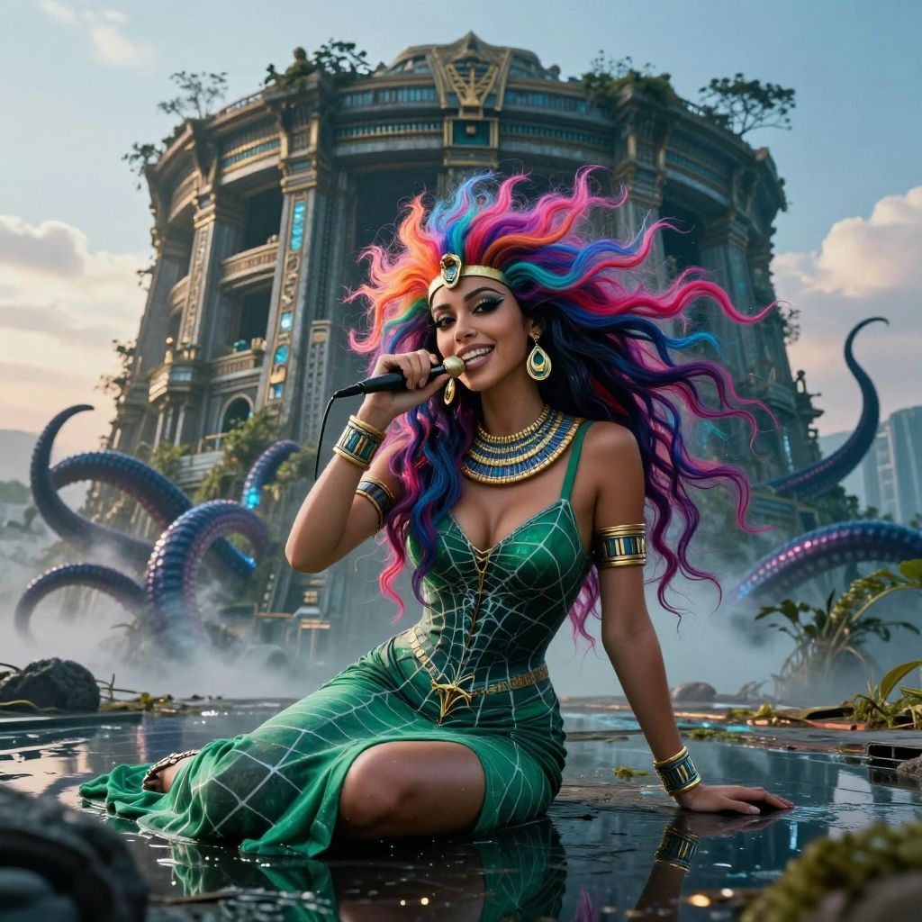 Highly insanely detailed, masterpiece, top quality, best quality, highres, 4k, 8k, RAW photo, ((ancient egyptian theme:1.2)), Hong Kong structure, building, structure, taiwan, korean, post-apocalyptic, swirling energy, tentacle, (underwater), reflection, reflective floor, abandoned building, overgrown with vegetation, [volumetric fog], cinematic lighting, colorful, colourful, (long_hair, long hair, random colors hair, glowing hair, hair over one eye, long messy hair), (eyelashes, eyeliner, eyeshadow, eyelashes, long eyelashes), collar, earrings, jewelry, necklace, armlet, nsfw, cleavage, perfect body, makeup, action pose, drunk, biting, dawn, solo, 1girl, smirk, looking at viewer, ulalap2, green dress, spider web print, sitting, short hair