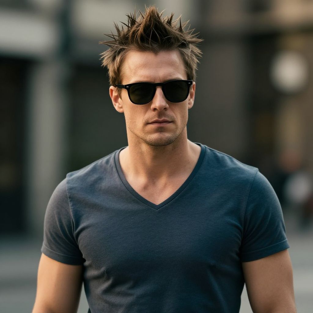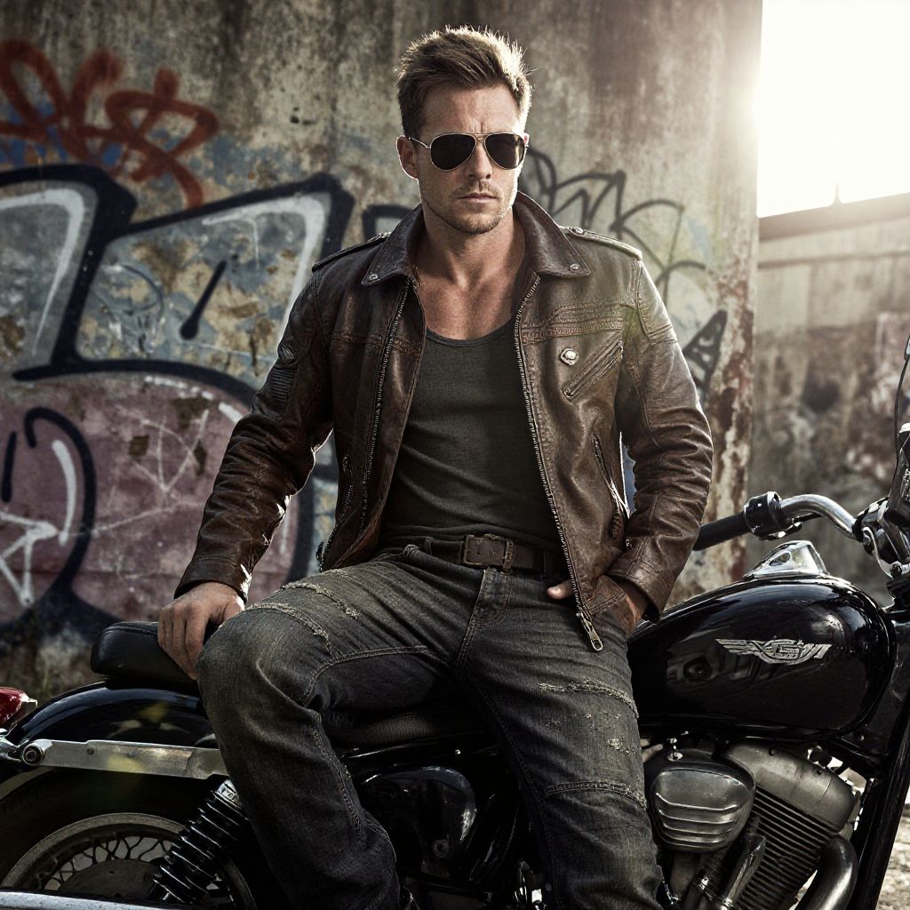 Rugged male model leaning on vintage motorcycle, wearing rugged leather gear and aviator sunglasses, sun flare in background, gritty urban graffiti wall behind, strong masculine presence, high detail