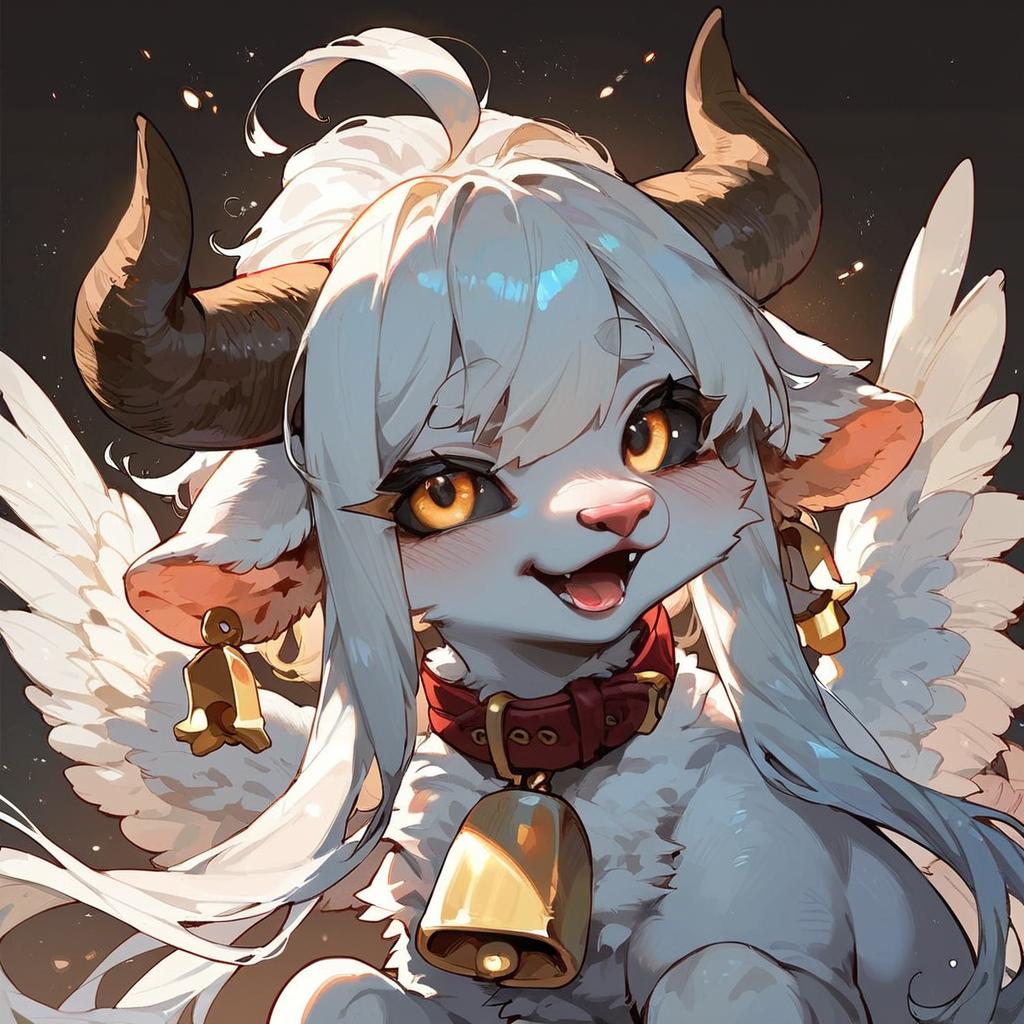Score_9, score_8_up, score_7_up, score_6_up, rating_safe, source_furry, detailed, (high quality, beautiful), fluffy, kemono, ├г┬В┬▒├г┬Г┬в├г┬Г┬О, soft lighting, fang, black_sclera, cow_print, happy, collar, icon, cowbell, feral, feathered wings