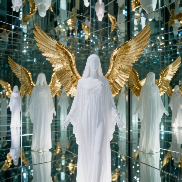 Photograph of a white, faceless, hooded statue with large, intricate, golden wings standing in the center of a mirrored room. The statue's wings are illuminated, reflecting light and creating a radiant effect. Multiple reflections of the statue are visible in the background, adding depth. The mirrors are segmented by thin, metallic lines, contributing to a futuristic, almost celestial atmosphere. The overall image conveys a sense of otherworldliness and divinity.