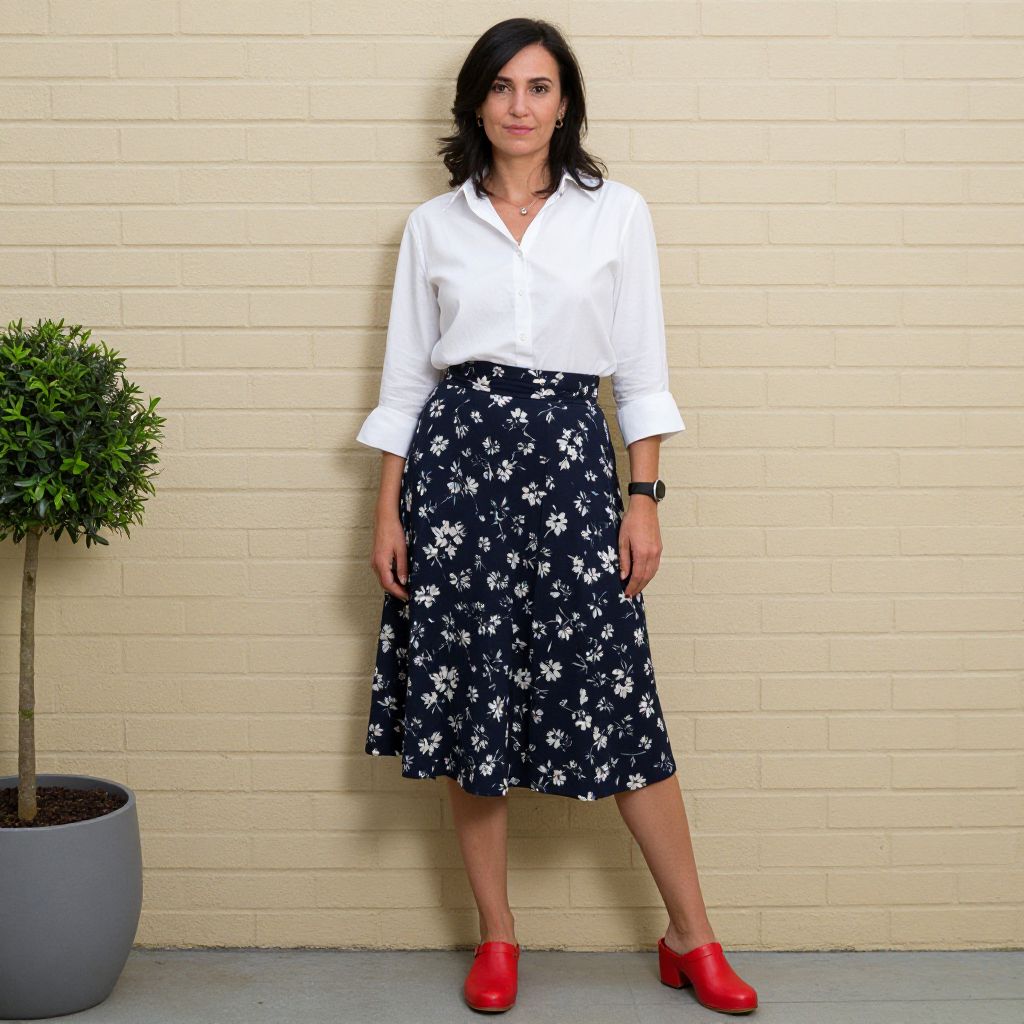 Woman standing confidently against a cream brick wall, wearing a crisp white blouse tucked into a navy floral skirt, accessorized with a black watch and bold red clogs, with a potted plant visible to her left.