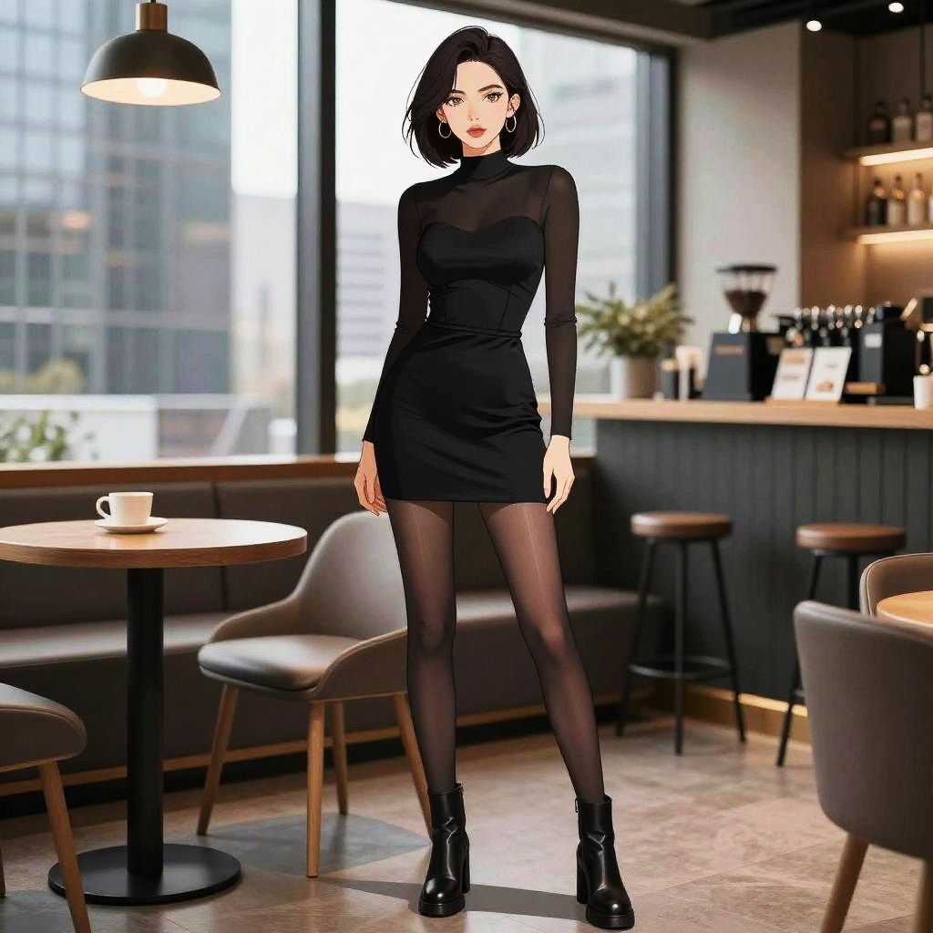 A woman, in a modern chic black mini dress with sheer details and fitted waist, paired with sheer black tights and chunky ankle boots, stands confidently at a trendy coffee bar in a modern skyscraper, illustrated in the style of NBM graphic novels. Sexy. Pretty face and beutiful eyes
