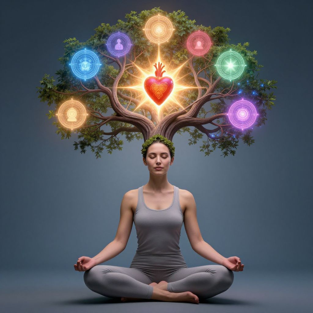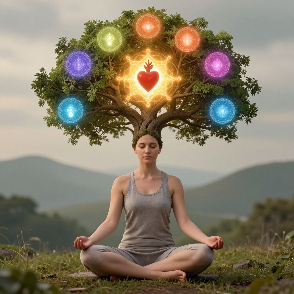 A serene woman in lotus pose is enveloped by a surreal tree that emerges from her head, its branches adorned with glowing chakras and a radiant heart at its center, symbolizing a harmonious fusion of human consciousness and nature's energy.