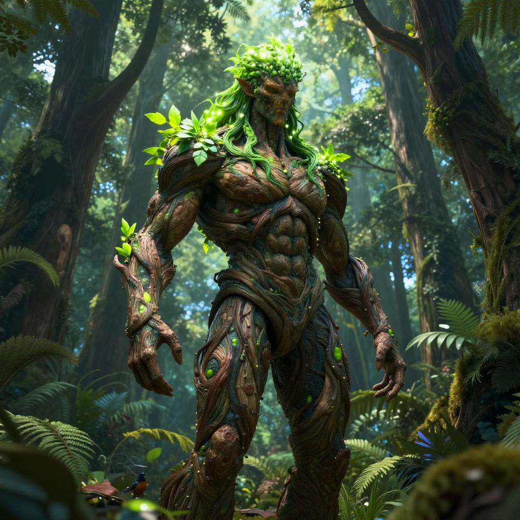 Digital art: Muscular, tree-like humanoid with green leaf hair and bark texture, standing in a lush, sunlit forest with ferns and tall