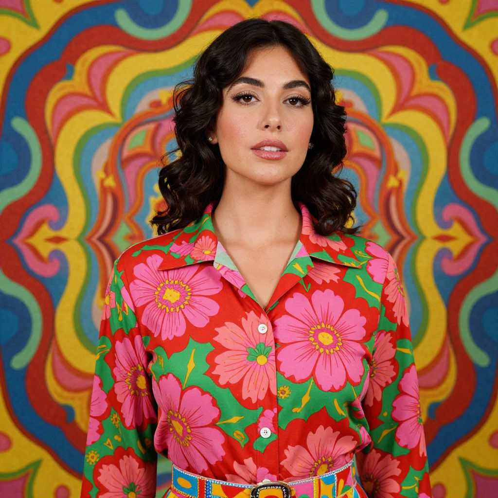 Vibrant vintage 1970s psychedelic patterns burst forth in a dazzling display, featuring a bold red, pink, and green floral shirt worn by a woman with dark, wavy hair, set against a kaleidoscopic backdrop of swirling geometric designs.