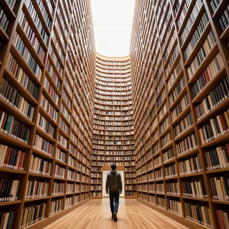 Photograph of a towering, narrow library with wooden bookshelves on both sides, filled with books of varying sizes and colors. The shelves rise to a curved ceiling, creating a tunnel-like effect. A solitary person, dressed in dark clothing, walks away from the camera towards a bright, white-lit exit at the far end. The floor is made of light-colored wood, contrasting with the rich brown of the shelves. The overall ambiance is warm and scholarly, with an emphasis on vertical symmetry and the vastness of knowledge.