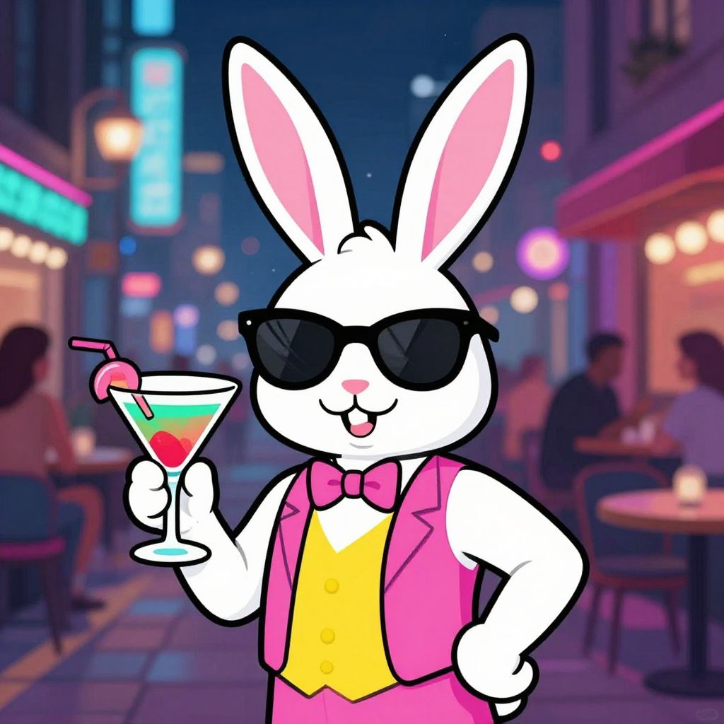 Playboy clipart graphic featuring a chic rabbit mascot wearing sunglasses and holding a cocktail, illustrated in vibrant colors with a pop art influence, set against a lively urban nightlife scene to convey a fun and stylish atmosphere.