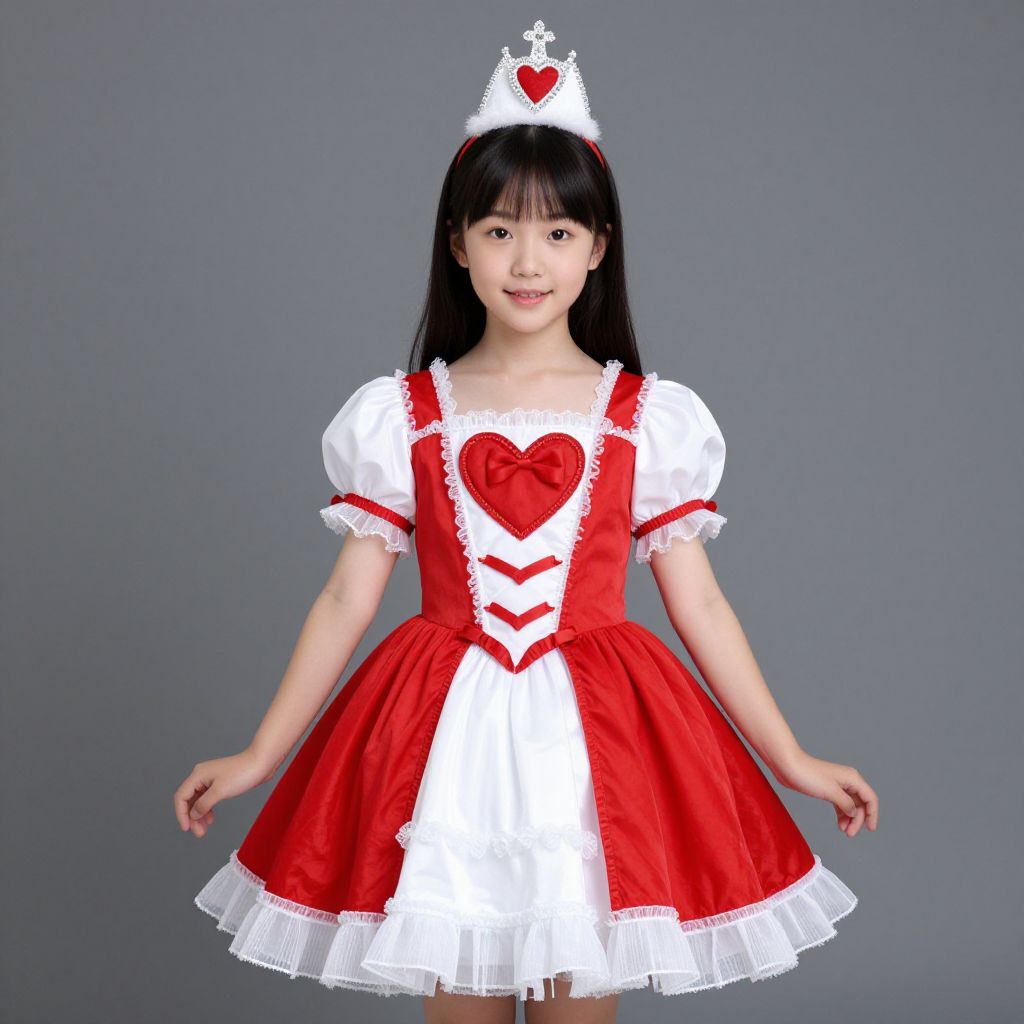 Photograph of an Asian girl with straight black hair, wearing a red and white dress with puffed sleeves, a red heart-shaped chest detail, and white lace trim. She also wears a white crown with a red heart on top. The dress has a full skirt with white layers peeking out at the bottom. She stands against a plain gray background, smiling slightly, with her arms relaxed by her sides. The costume has a playful, fairy-tale or princess-like style.