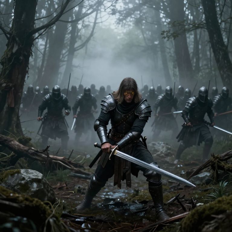 In a dense, fog-shrouded forest, a warrior emerges from the low-lying mist, his body armor gleaming under the dim light. His yellow eyes glow with an intense determination, and he wields a sword and a knife, ready for battle. The swampy ground beneath him is dotted with rocks and fallen trees, adding to the ominous atmosphere. In the background, an attacking army of at least 25 soldiers, dressed in dark armor, advances through the mist, their forms slightly blurred by the dense fog. The scene is rendered in an ultra-realistic style reminiscent of Frank Frazetta's artwork, with a strong emphasis on the interplay of light and shadow, creating a sense of depth and realism. The warrior's position in the foreground, with the army in the background, creates a dynamic tension between the lone hero and the encroaching enemy, setting the stage for a fierce confrontation.
