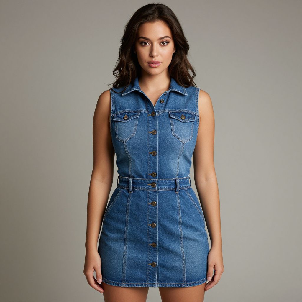 Photograph of a young woman with medium-toned skin, dark wavy hair, and brown eyes. She wears a sleeveless, blue denim dress with a fitted waist, six buttons down the front, and two chest pockets. The dress has a slight sheen and textured fabric. She stands against a plain, light gray background, looking directly at the camera with a neutral expression. The lighting is even, highlighting the dress's details and her natural beauty. Her arms are relaxed by her sides. The overall style is modern and casual.