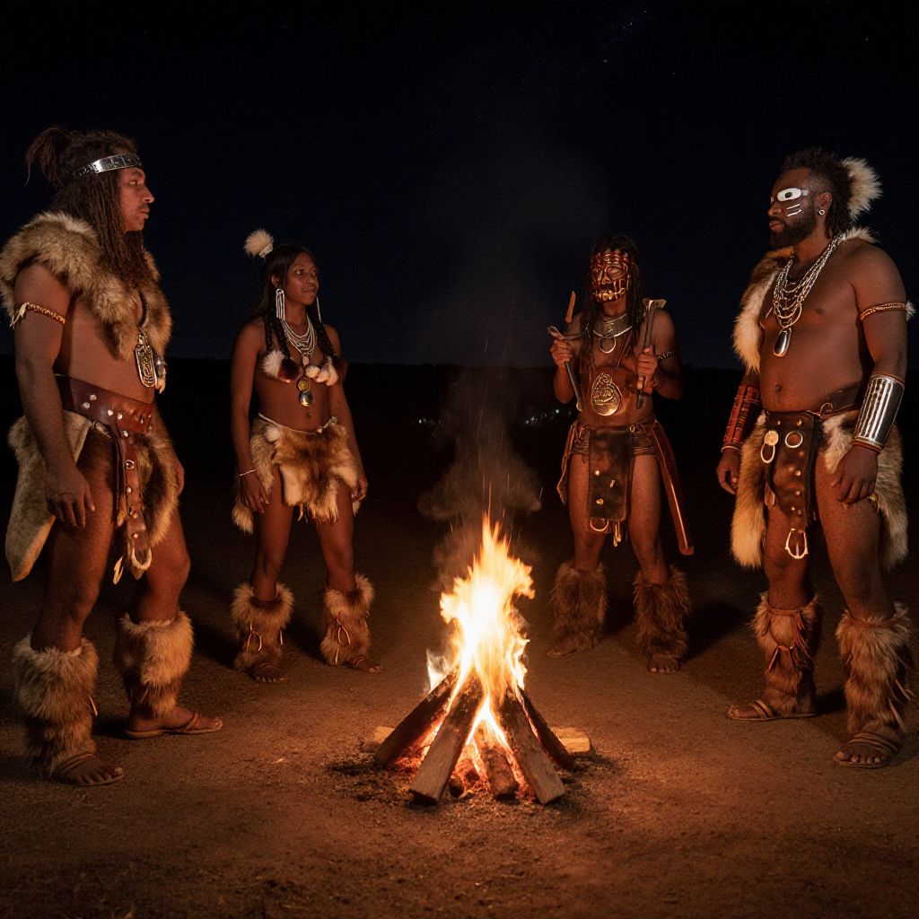 Prehistoric outfits combining rugged textures of fur and leather with hand-crafted tools and ornaments, modeled by cave dwellers beside a flickering campfire under starry night skies, emphasizing the survival and community spirit.