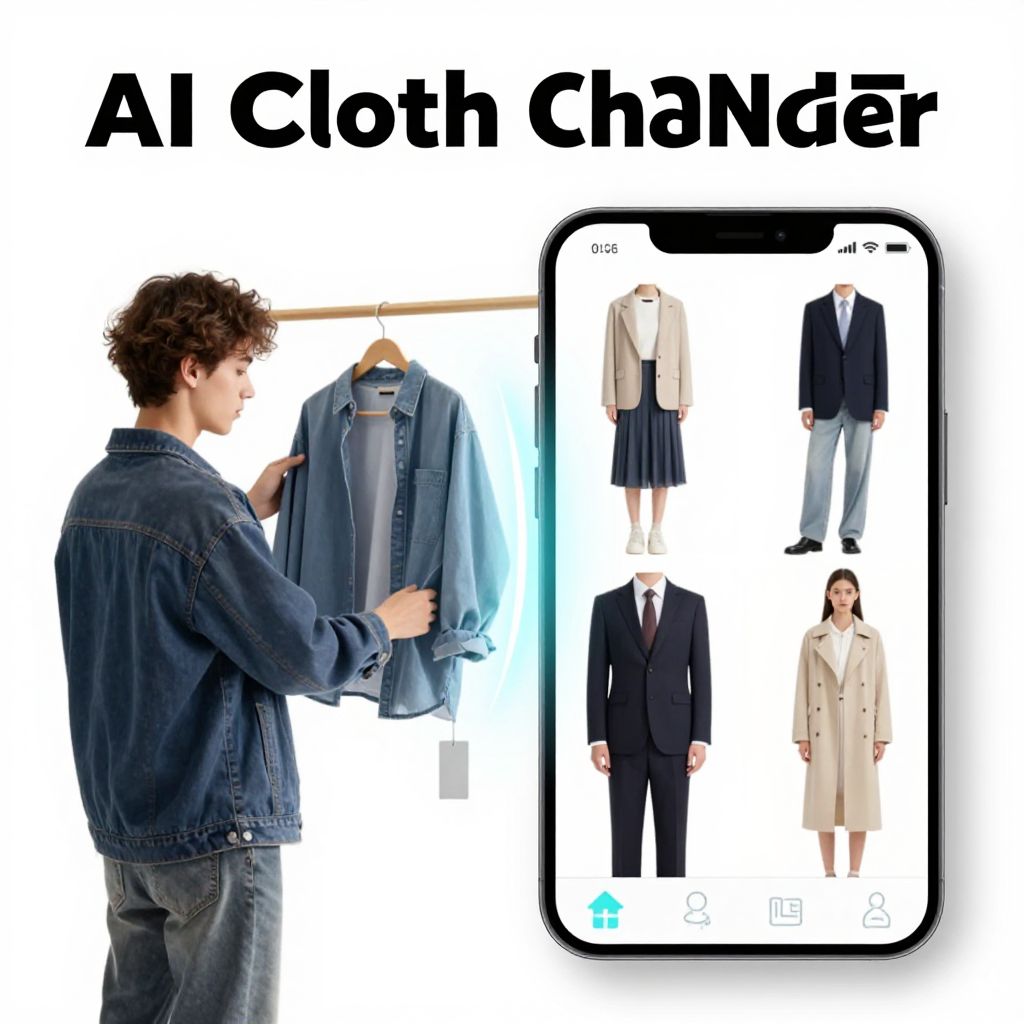 AI clothes changer free application visualization with a young person seamlessly swapping outfits in real-time, augmented reality effects, diverse casual and formal fashions displayed, clean white background, neon highlights, emphasizing innovation in fashion tech and digital transformation.
