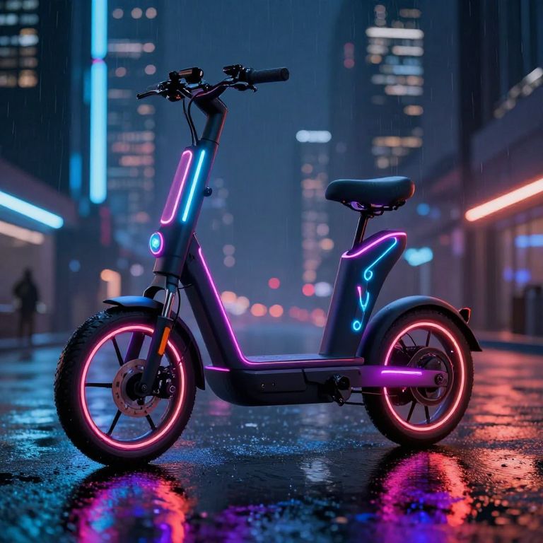 Neon-lit, futuristic electric scooter on a rain-soaked city street at night, with vibrant blue, pink, and red lights reflecting on wet