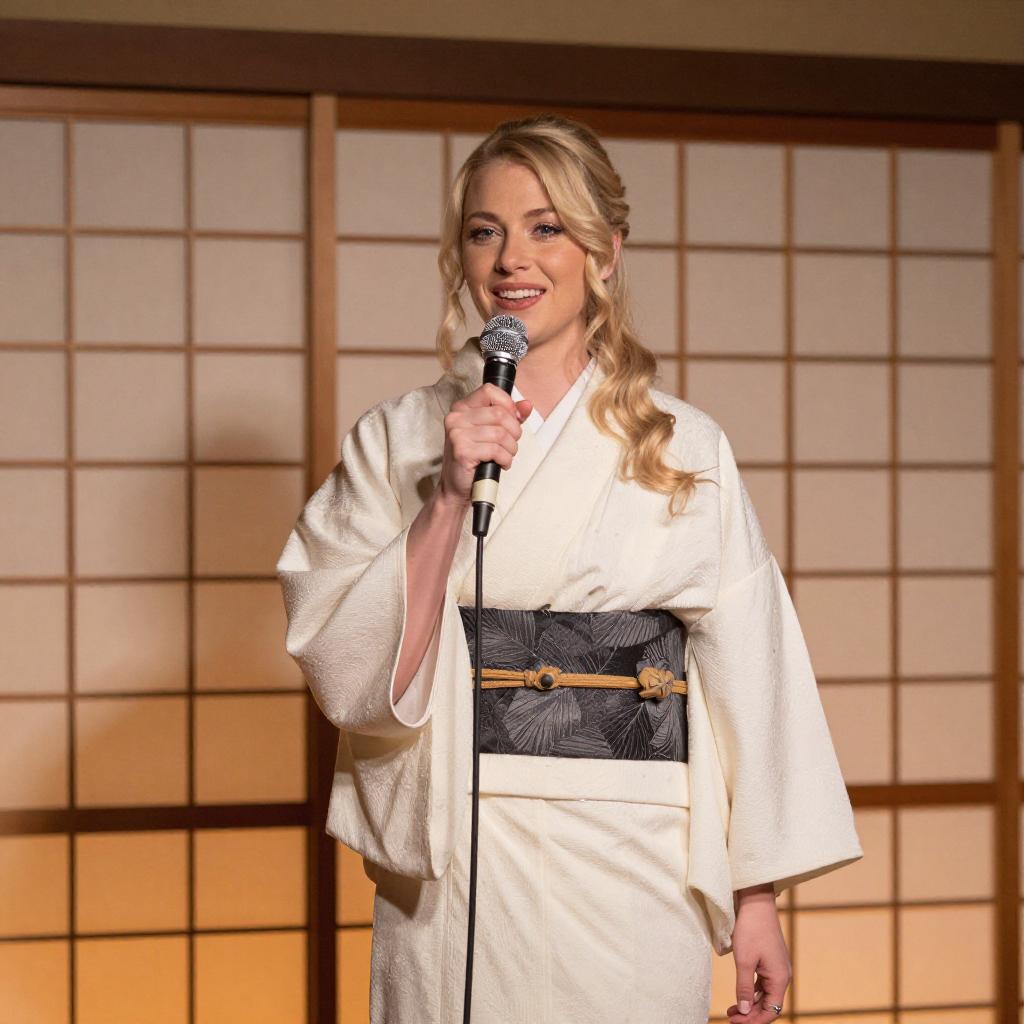 Photograph of a blonde woman with wavy hair, wearing a white, polka-dotted kimono with a black belt, standing in front of a shoji screen. She holds a microphone in her right hand, smiling, with warm orange lighting casting shadows on the screen behind her.