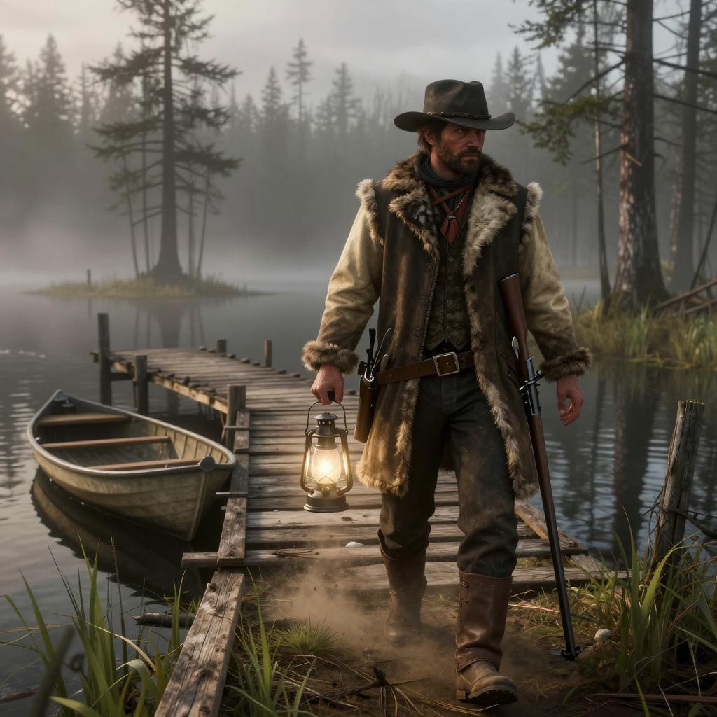 Red dead redemption 2 style, bank escape through narrow alleyways on horseback featuring young gunslinger with neat vest, bandana, and confident glare in misty forest clearing with tall pines and shafts of light, wide panoramic composition with leading lines from road and fences, cinematic western lighting, detailed cowboy clothing, atmospheric particles and depth, no gore, ultra-detailed, 4k