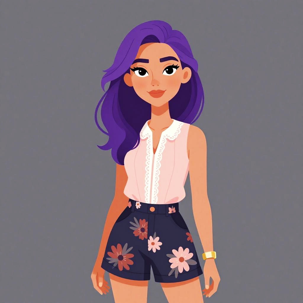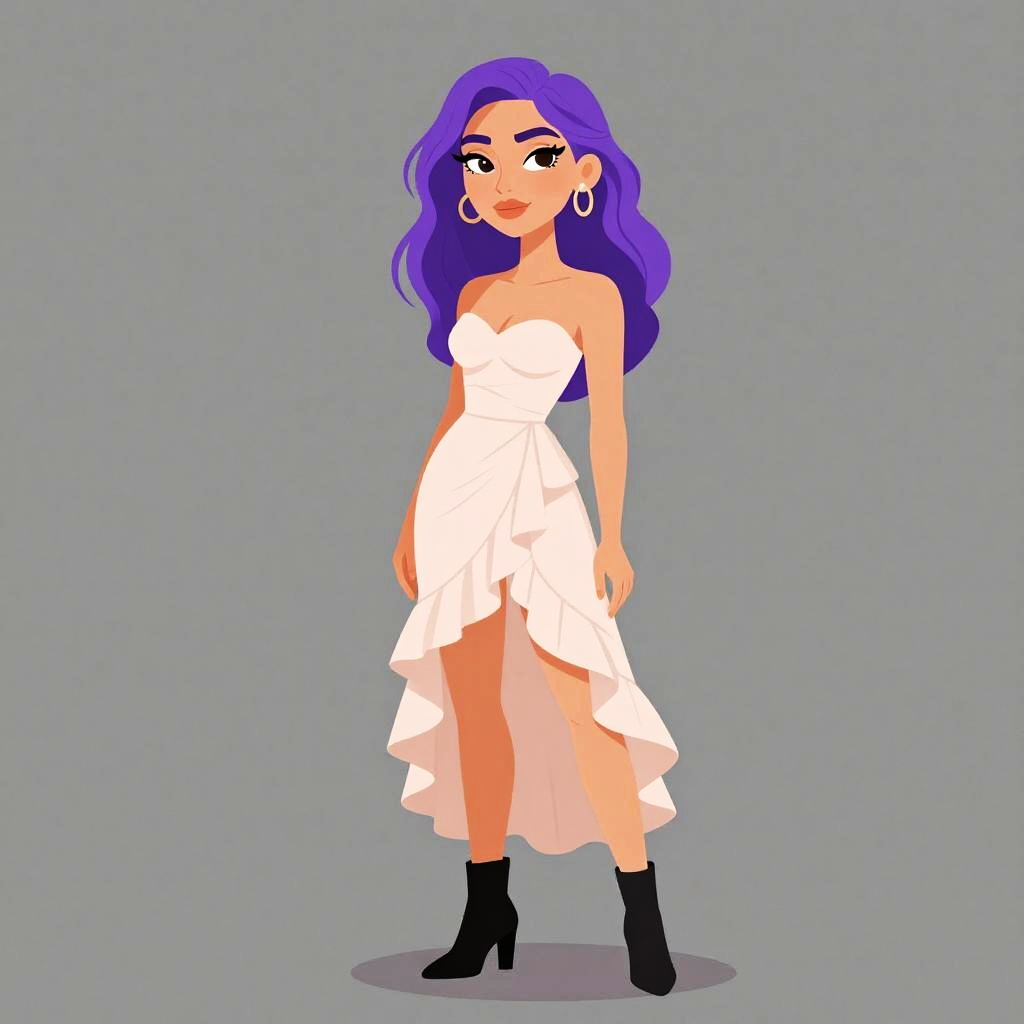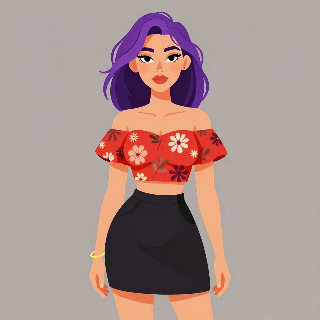 Woman with pretty face and pretty hair. Woman, bohemian-romantic, cropped puff sleeve top in off-white, square neckline, midriff-baring, high-waisted linen maxi skirt, relaxed fit, ankle length, strappy black sandals with heels, minimalist gold necklace, studio background with a plain light color. --sref 1467