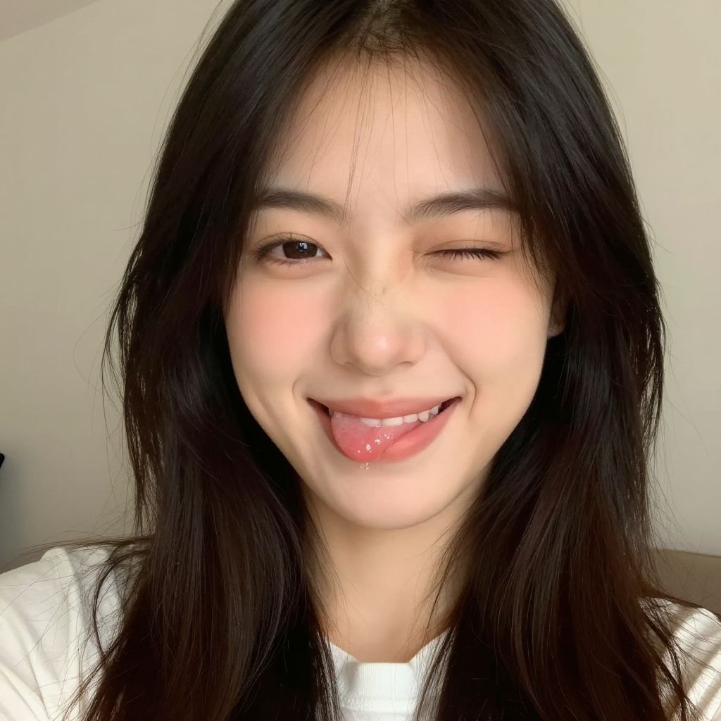 Photorealistic digital image of a young woman with fair skin, blue eyes, and long, wavy blonde hair. She has a wide, joyful smile with her tongue out, touching the corner of her mouth with her right index finger. Her lips are full and pink, her teeth are white and straight, and her nails are polished silver. She wears small diamond stud earrings. The background is blurred and dark, making her face the focal point. The lighting highlights her smooth skin and expressive eyes, giving the image a vibrant, lively feel.